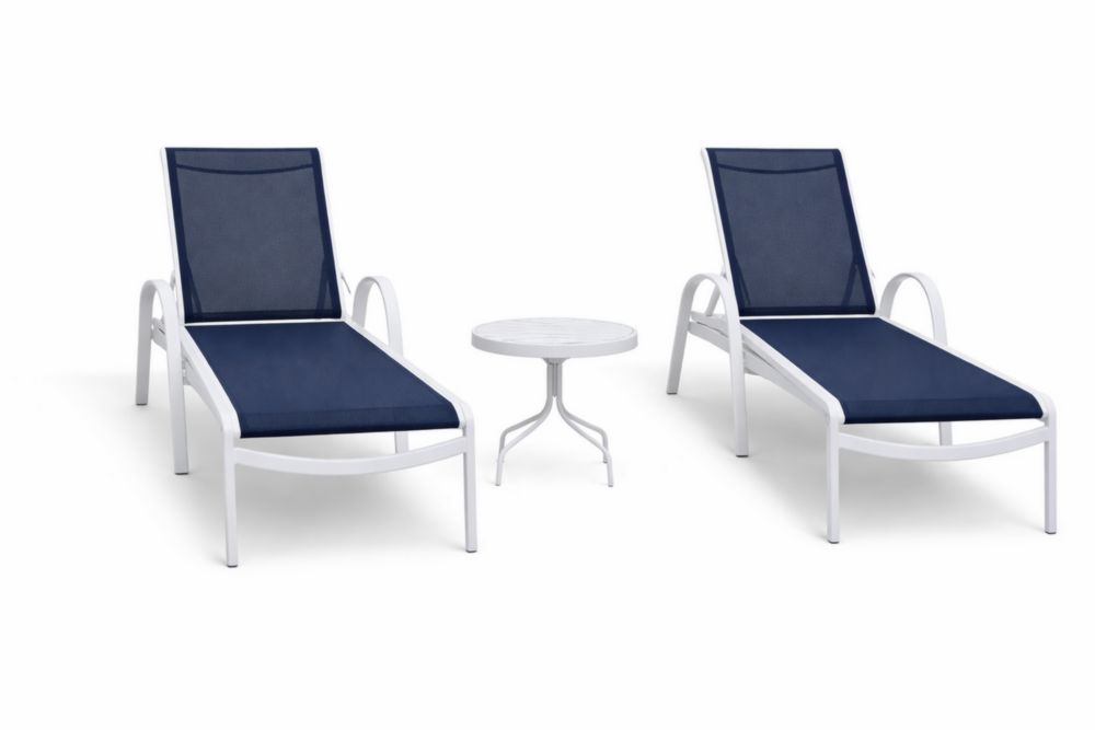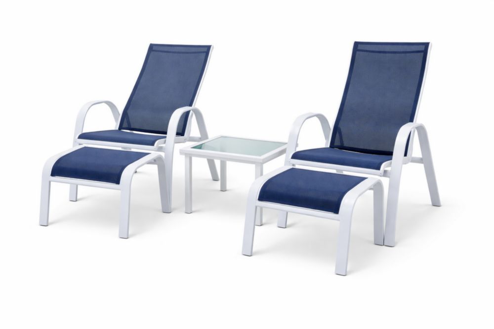 Ensemble de chaises longues en aluminium blanc avec textilène bleu et table en verre trempé